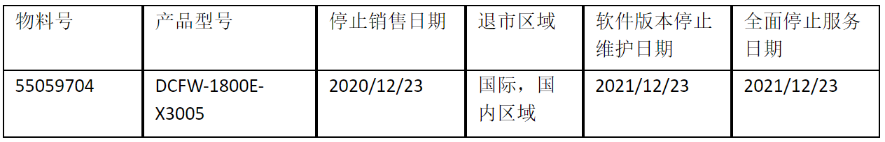 北京PA真人视讯数码云科信息技术有限公司正式通知您, 以上DCFW-1800E-X3005下一代防火墙(55059704)将于20201223号停止接收新的订单(具体日期见上表),不再供货。给您带来的不便,敬请原谅。